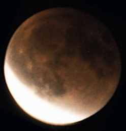 | 02ч.53м.10с. | Более половины лунной поверхности вышло из тени. Затмение подходит к концу. Яркость продолжает увеличиваться. На освещённой части видны кратеры и моря. Звёзд вокруг Луны не видно. | ![]() |