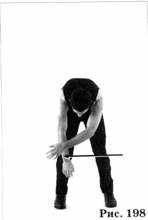 Зафиксируйте неподвижно колени и до предела напрягите подколенные сухожилия. Наклоните корпус вперед — так, чтобы голова находилась почти на уровне коленей, а руки свисали перед корпусом. Поднимайте и опускайте руки, как показано на рис. 203 и 204. Они должны расходиться при движении вперед и вверх и сходиться при возвращении вниз и назад. Таким образом, траектории рук образуют острый угол, вершина которого расположена между раздвинутыми ногами.