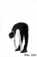 Одновременно с глубоким вдохом поднимите руки над головой. С глубоким выдохом наклонитесь и коснитесь пола. Зафиксируйте неподвижно колени, а подколенные сухожилия до предела напрягите. Суставами пальцев рук прикоснитесь к верхней поверхности пальцев ног и завершите выдох (Рис. 210). Задержитесь в этом положении и сделайте глубокий вдох. Затем выпрямитесь и поднимите руки над головой. Опуская руки на уровень талии, сделайте выдох.