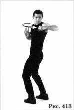 держите рукоять кинжала; ладонь обращена вниз. Нанесите левым локтем удар по дуге назад, в точку, находящуюся на высоте плеча, позади него, под углом сорок пять градусов к плоскости тела (Рис. 413). Верните руку в исходное положение, нанося такой же удар, но в обратном направлении.