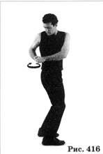 Опишите сцепленными кистями в горизонтальной плоскости маленький круг вправо и верните их в исходное положение. Поскольку левая рука находится сверху и является ведущей, то при описании круга она должна прилагать большие усилия, толкая обе кисти сначала вправо и далее — по кругу (Рис. 416).