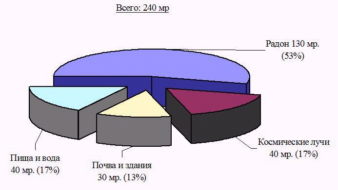 Они дают внутреннее облучение 40 миллирентген в год, или 17 % общего природного фона. Таким образом, доза облучения, получаемая человеком от природных источников, составляет примерно 240 миллирентген (0,24 рентгена) в год. При этом внутреннее облучение оказывается в 2,5 раза больше внешнего.