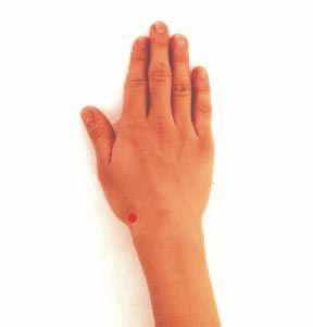![]() | Кисть выпрямлена - локтевая поверхность лучезапястного сустава. Точка расположена на внутреннем (локтевом) крае кисти, в промежутке между основанием пятой пястной кости и костями запястья; проецируется в месте прикрепления локтевого разгибателя запястья и мышцы, отводящей пятый палец; здесь проходит тыльная запястная ветвь локтевой артерии, тыльная венозная сеть, тыльные ветви локтевого нерва. |