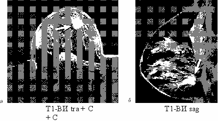 Неоднородная внутренняя структура является признаком, более характерным для образований злокачественной природы (р < 0,001) — 86 % больных. Однако следует отметить, что неоднородной МР-структурой характеризовались и некоторые доброкачественные процессы (28,6 %), что осложняло дифференциальную диагностику (локализованная форма фиброаденоматоза, интраканаликулярные фиброаденомы, листовидные опухоли, воспалительные изменения и гамартомы).