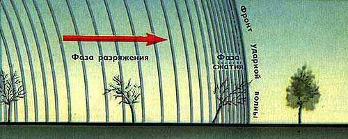 Это основной поражающий фактор ядерного взрыва, который производит разрушение, повреждение зданий и сооружений, а также поражает людей и животных. Источником УВ является сильное давление, образующееся в центре взрыва (миллиарды атмосфер). Образовавшееся при взрыве раскаленные газы, стремительно расширяясь, передают давление соседним слоям воздуха, сжимая и нагревая их, а те в свою очередь воздействуют на следующие слои и т.д. В результате в воздухе со сверхзвуковой скоростью во все стороны от центра взрыва распространяется зона высокого давления.