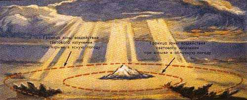 Световое излучение (СИ) – это поток лучистой энергии (ультрафиолетовые и инфракрасные лучи). Источником СИ является светящаяся область взрыва, состоящая из нагретых до высокой температуры паров и воздуха. СИ распространяется практически мгновенно и длится в зависимости от мощности ядерного боеприпаса (20-40 секунд). Однако не смотря на кратковременность своего воздействия эффективность действия СИ очень высока. СИ составляет 35% от всей мощности ядерного взрыва. Энергия светового излучения поглощается поверхностями освещаемых тел, которые при этом нагреваются. Температура нагрева может быть такой, что поверхность объекта обуглится, оплавится, воспламенится или объект испарится. Яркость светового излучения намного сильнее солнечного, а образовавшийся огненный шар при ядерном взрыве виден на сотни километров. Так, когда 1 августа 1958 г. американцы взорвали над островом Джонстон мегатонный ядерный заряд, огненный шар поднялся на высоту 145 км и был виден с расстояния 1160 км. Поражающее действие светового излучения характеризуется световым импульсом, т. е. количеством световой энергии, приходящейся за время излучения на 1 см2 поверхности, перпендикулярно расположенной к направлению световых лучей. За единицу измерения светового импульса принимают 1 кал/см2. Световое излучение может вызвать ожоги открытых участков тела, ослепление людей и животных, обугливание или возгорание различных материалов. Так, при световом импульсе 2—4 кал/см2 у незащищенных людей могут возникнуть ожоги первой степени, при 4—6 кал/см2— ожоги второй степени (образование пузырей), при 6— 12 кал/см2—ожоги третьей степени (полное омертвление кожных покровов), при световом импульсе более 12 кал/см2 кожа омертвляется на всю глубину и обугливается. Световое излучение способно вызвать массовые пожары в населенных пунктах, в лесах, степях, на полях, так как неокрашенные доски воспламеняются при световом импульсе 40—50 кал/см2; светлая хлопчатобумажная ткань—при 10—15 кал/см2, сено или солома— при 4—6 кал/см2. Защитить от светового излучения могут любые преграды, не пропускающие свет: укрытие, тень густого дерева, забор и т. п. Основным параметром, определяющим поражающую способность СИ, является световой импульс: это количество световой энергии на единицу площади поверхности, измеряемое в Джоулях (Дж/м2). Интенсивность СИ с увеличением расстояния уменьшается вследствие рассеивания и поглощения. Интенсивность светового излучения сильно зависит от метеорологических условий. Туман, дождь и снег ослабляют его интенсивность, и, наоборот, ясная и сухая погода благоприятствует возникновению пожаров и образованию ожогов.