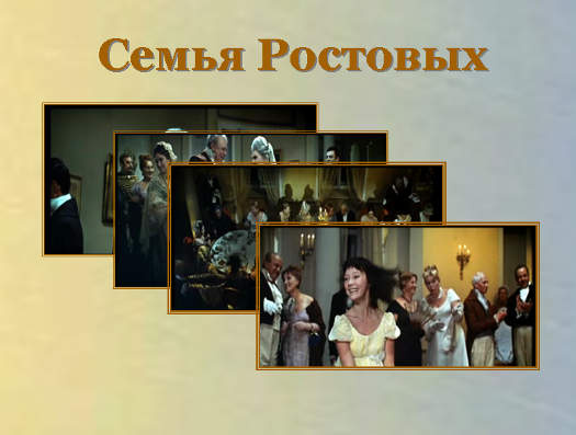 Наиболее близка Толстому семья Ростовых. Литературный критик Н.Н.Страхов сказал об этой семье так: «Ростовы – простое, добродушное, провинциальное по своей сути семейство, наподобие Лариных, тесно связанное с деревней и сохраняющее весь строй, все предания русской жизни»