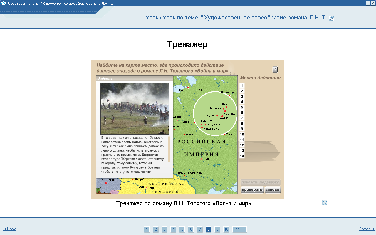 Работа с тренажером по содержанию текста романа «Война и мир».