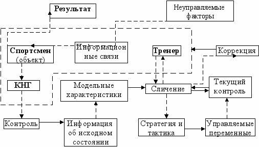 тся: тренировочная нагрузка, специфические физические упражнения, арсенал технических средств, педагогические средства восстановления и другие факторы, обеспечивающие спортивный результат. В отдельную подсистему управления выделяется блок «СПОРТСМЕН-КНГ-ТРЕНЕР». Тренер, получив информацию от КНГ, выступает в роли управляющего, а спортсмен – управляемого. Связь между ними обеспечивает информационный блок. Информация, поступающая от тренера к спортсмену, является прямой связью между блоками системы, информация от спортсмена к тренеру – обратной связью. По каналу обратной связи тренер получает информацию о субъективном состоянии спортсмена. Роль информационного обеспечения возрастает на этапе непосредственной подготовки, ибо любые ошибки, допущенные на ранних этапах, становятся непоправимыми, что выражается не только в снижении спортивного результата, но и приводит к срыву функциональных систем организма. Предложенная система управления позволяет не только управлять тренировочным процессом, но и упорядочить систему контроля над развитием специфических качеств, обусловливающих спортивные достижения в избранном виде спорта, что позволяет решать задачи оптимизации тренировочного процесса не только эффективно, но и на более высоком качественном уровне.