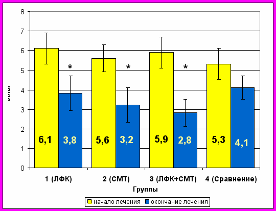 | ЛФК+СМТ | 4,1 ± 0,7 | 6,9 ± 0,9* | |
