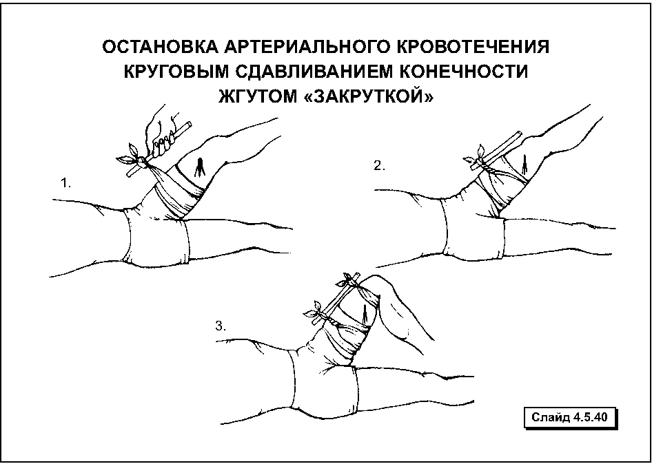 5. Круговое сдавливание конечности жгутом резиновым или жгутом «закруткой» (слайд 4.5.40).