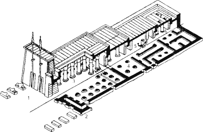| 1 - аллея сфинксов; 2 - пилоны; 3 - колонный двор; 4 - гипостильный зал; 5 - зал священной ладьи бога; 6 - "святая святых"; 7 - осветительные окна. |