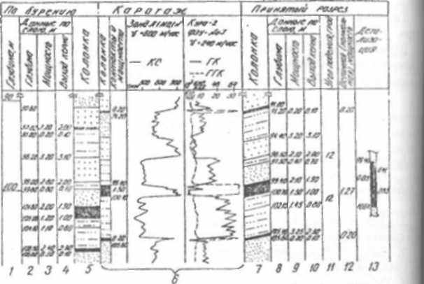Столбец 6 (каротажные данные) заполняется геофизической службой. Столбец 12 - истинная или нормальная мощность слоя (mист) заполняется, ис