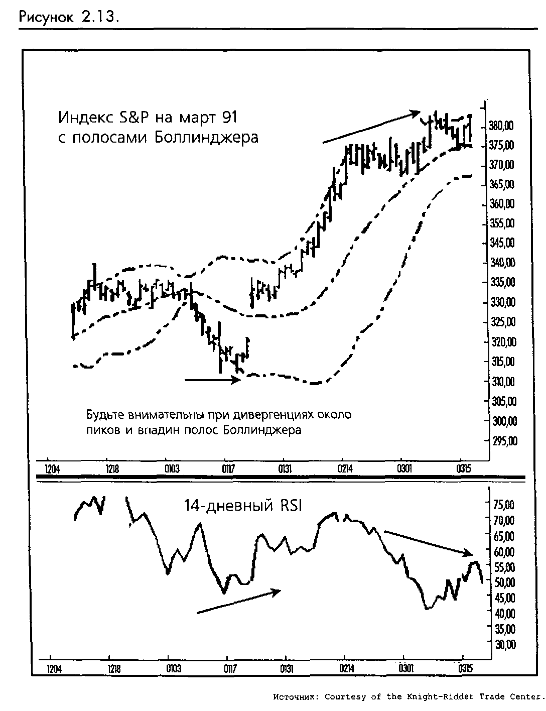 Полосы Боллинджера обычно используются наряду с другими техническими исследованиями для определения поворотов тренда на рынке ценных бумаг. Если цены близки к нижней границе и другое исследование подтверждает поворот, следовательно, должно быть безопасно покупать. Например, дивергенция RSI может использоваться для подтверждения дна в нижней части конверта. (Смотрите рисунок 2-13.)