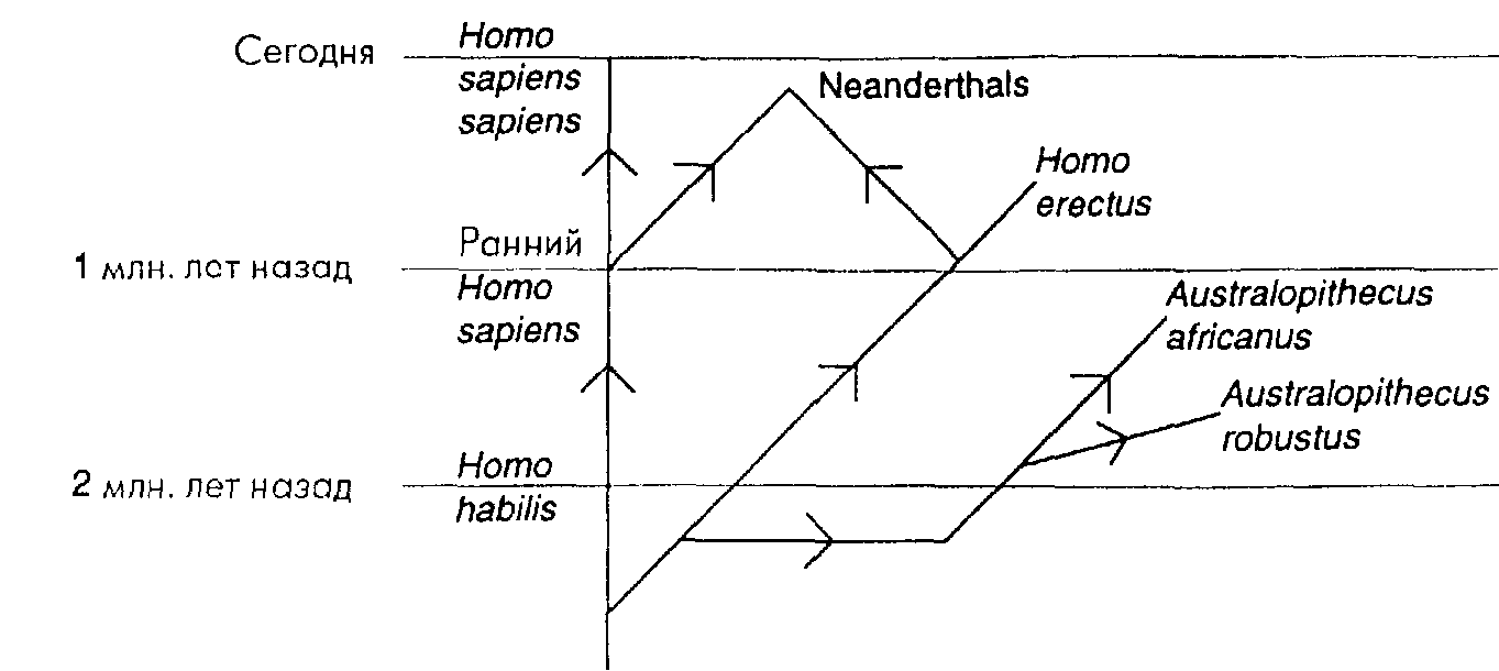 Рис. 12.6. Согласно Луи Лики, ни Australopithecus, ни Homo erectus не были предками современных людей. Возможно, что неандертальцы, указывал Лики, появились в результате скрещивания Homo erectus и Homo sapiens. И в наши дни вокруг деталей эволюции человека не утихают острые дискуссии. Но большинство палеоантропологов поддерживают ту точку зрения, что первичным звеном в родословной человека был один из австралопитеков, который, в свою очередь, привел к появлению Homo habilis, Homo erectus и раннего Homo sapiens. От последнего и произошли неандертальцы и современные люди.