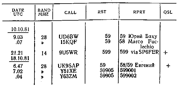 Форма аппаратного журнала достаточно произвольна. Помимо приведенных выше обязательных данных в него часто вносят различную дополнительную информацию, облегчающую учет связей, «охоту» за дипломами и т. д. Это может быть, например, порядковая нумерация радиосвязей, отметки о получении и отправлении QSL, записи об азимуте направленной антенны, об экспериментах с антеннами и многое другое, что представляет интерес для самого радиолюбителя.