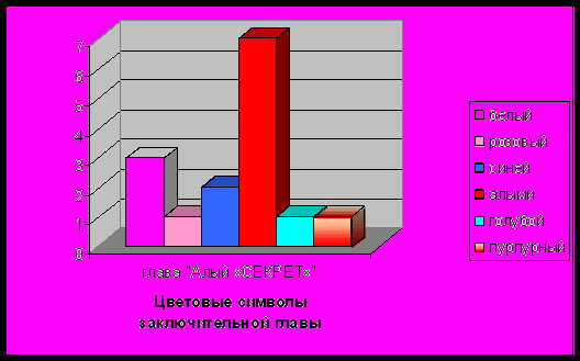 В заключении, подводя итог литературного изыскания на тему «Символическое значение цветовой детали в повести А.Грина « Алые паруса»,я приведу диаграмму, отражающую частотность употребления цветовых символов.