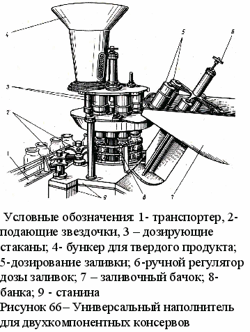 ля таких консервов как зеленый горошек, кукуруза разработаны специальные наполнители (рисунок 66). Представляет собой двухбашенный автомат непрерывного действия. На станине (9) смонтированы продуктовый (4) и заливочный (7) бачки. Сначала дозируется твердый продукт по объему с помощью дозирующих стаканов (3), а затем жидкая часть по уровню с помощью поршня, который перемещается в цилиндре (5). Транспортер (1) подает пустые банки, которые при помощи звездочек (2) передаются на вращающийся стол, где происходит фасовка. Дозу заливки устанавливают с помощью ручного регулятора (6). Наполнитель имеет автоматическое блокирующее устройство, которое останавливает машину в случае отсутствия пустых банок.Несмотря на наличие многообразных наполнителей, многие продукты фасуются вручную. Это относится к таким нежным ягодам как малина, земляника, а также при закладке в одну банку разных компонентов с соблюдением точных весовых соотношений (фаршированный перец; кабачки, баклажаны, нарезанные кружками с фаршем и т.д.).