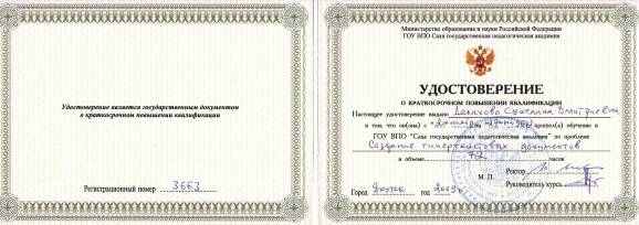 2009 г. - Проблемные курсы повышения квалификации ГОУ ВПО «СГПА» «Создание гипертекстовых документов», с. Намцы (удостоверение ).