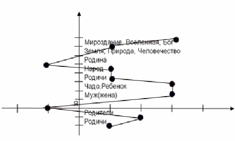 Вверху расположим два животворящих начала Вселенной: мужское и женское. Обратите внимание: муЖ – Жена, а Ж в древнерусском языке означает Жизнь, Жи-вот. Живот порождает третью жизнь – чадо (чудо). Вслед за ребенком идут родичи. Я окружен своими родственниками. Потом идет народ, который формирует пространство – Родину. В этом пространстве жизнь невозможна без природы. А все это располагается на планете Земля, которая является частью Вселенной.