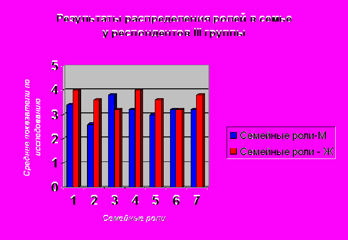 К 7-17 годам супружества (III период) закрепилось традиционное распределение ролей. Муж отвечает за материальное обеспечение семьи и сексуальные отношения, жена - за воспитание детей, за эмоциональный климат семьи, за организацию развлечений, за хозяйство и, по мнению самих жен, еще и за семейную субкультуру, хотя мужчины считают, что эту функцию они выполняют поровну. По мнению мужчин этой группы, они больше занимаются воспитанием детей, чем мужчины второй группы, а их жены несколько активней участвуют в сексуальных отношениях.