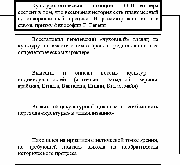 Синтез как источник культурной динамики представляет собой взаимодействие и соединение разнородных элементов, образующих качественно новое содержание или форму. Он имеет место в тех случаях, когда социокультурная система осваивает достижения иных культур в тех сферах, где собственные элементы оказываются недостаточно развиты, но при этом в целом сохраняет свою собственную основу. В качестве примера можно привести элементы материальной и духовной культуры Японии или исламскую цивилизацию на рубеже VII – IX вв., выступающую в форме синтеза монотеизма, античных ценностей и политической культуры персидской цивилизации. ОСНОВНЫЕ ТЕОРИИ В МИРОВОЙ КУЛЬТУРОЛОГИИ ![]() ОСНОВНЫЕ КУЛЬТУРОЛОГИЧЕСКИЕ ШКОЛЫ XX в. И ИХ ПРЕДСТАВИТЕЛИ ![]() ТЕОРИЯ КУЛЬТУРНО-ИСТОРИЧЕСКИХ ТИПОВ Н.Я. ДАНИЛЕВСКОГО ![]() ![]() КОНЦЕПЦИЯ НАДСТРОЕЧНОГО РАЗВИТИЯ КУЛЬТУРЫ ![]() ЧЕТЫРЕ ЭПОХИ В КУЛЬТУРОЛОГИИ К. ЯСПЕРСА ![]() Концепция культуры О. Шпенглера ![]() ![]() ![]() Концепция культуры П.А. Сорокина ![]() З. Фрейд и его понимание культуры ![]() ИСТОРИЯ КУЛЬТУРЫ Тема 6. Первобытная культура