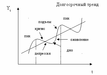 1. В современной исторической теории различают два типа движения национальной экономики во времени: трендовое и циклическое. Вековой тренд экономической динамики показывает необратимое движение экономики в направлении роста, что соответствует процессу последовательного расширения экономической системы в темпе, заданном внутренними возможностями долгосрочного роста. В то же время вокруг линии тренда происходят циклические колебания экономической активности, повторяющиеся с определенной регулярностью, что свидетельствует о происходящих в экономике обратимых процессах.