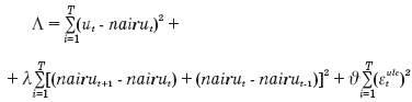 - остатки. Из закона Окуня коэффициент μ обычно полагается равным 0,33. Для оценки nairu часто применяется метод Элмескова – он основан на фильтре Ходрика-Прескотта, в качестве дополнительной информации о динамике безработицы используется модель рынка труда, предсказывающая, что реальная заработная плата будет расти, когда уровень безработицы ниже nairu, и наоборот. В итоге nairu находится из следующей задачи: