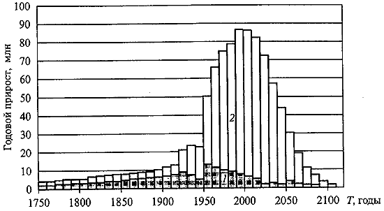 «Демографический переход с 1750-2100 гг. Прирост населения мира, осреднённый за декады. 1 - развитые страны; 2 - развивающиеся страны».