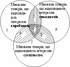 Забезпечити формування ринку екологічних товарів можна при достатній відповідності інтересам його суб’єктів. Конкретні товари здебільшого лише частково задовольняють інтереси різних суб’єктів ринку, які активно взаємодіють на ринку (екологічний товар може повністю влаштовувати одних і одночасно бути неприйнятним для інших). Звичайно, в загальному випадку інтереси різних суб’єктів ринку не є однаковими, вони можуть істотно відрізнятися. На рис. 3 показано, що екологічні товари можуть задовольняти інтереси суб’єктів ринку різною мірою.