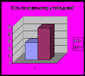 Целью нашего исследования было также выяснить роль компьютера в жизни учащихся школы. Нами было установлено, что у 30,7% числа учащихся есть дома компьютер (рис.5), практически все учащиеся (87%) умеют работать на ПК (рис.6) , пользоваться Интернетом (35%) в основном старшеклассники (рис.7). Это объясняется тем, что в селе для Интернета в школе есть специальная выделенная линия, а жители поселка такой возможности не имеют.