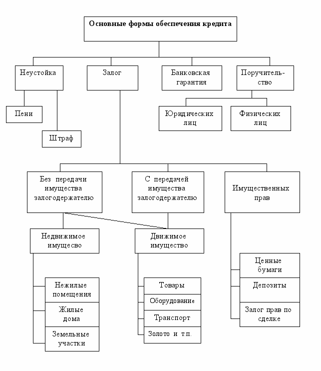 3. Обеспеченность кредита закрывает один из основных кредитных рисков – риск непогашения ссуды. Если бы не принимался во внимание этот принцип, то банковское дело превратилось бы в спекулятивное занятие, где высокий риск ведения операций привел бы к резкому росту процентных ставок. Основные формы обеспечения кредита показаны на рис. 1.1