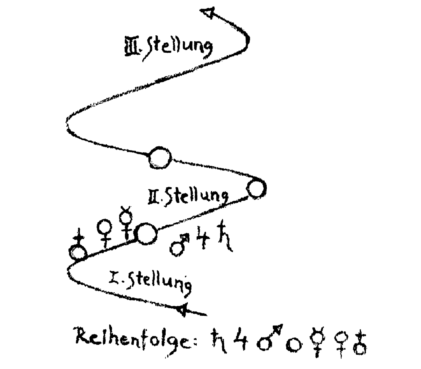 Вот, например, (положение 1), здесь находится Солнце; здесь Сатурн, Юпитер, Марс, а здесь Венера, Меркурий, Земля. И вот все они так друг за другом передвигается в заданном направлении (винтообразная линия), так что, когда Солнце затем перешло сюда (положение И), Сатурн, Юпитер и Марс находятся здесь, Венера, Меркурий и Земля – там. И теперь Солнце вращается дальше и идет туда (положение III). Тем самым вызывается иллюзия, как будто 3емля вращается вокруг Солнца. На самом деле Солнце идет впереди, а Земля всегда ползет за ним.