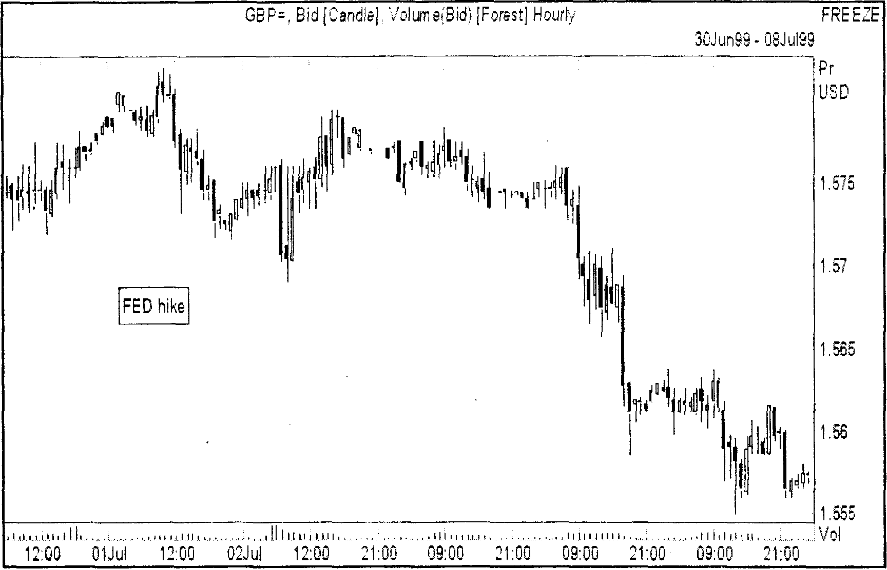 Рис. 16.2. Повышение ставок FED 1 июля 1999 г., график британского фунта