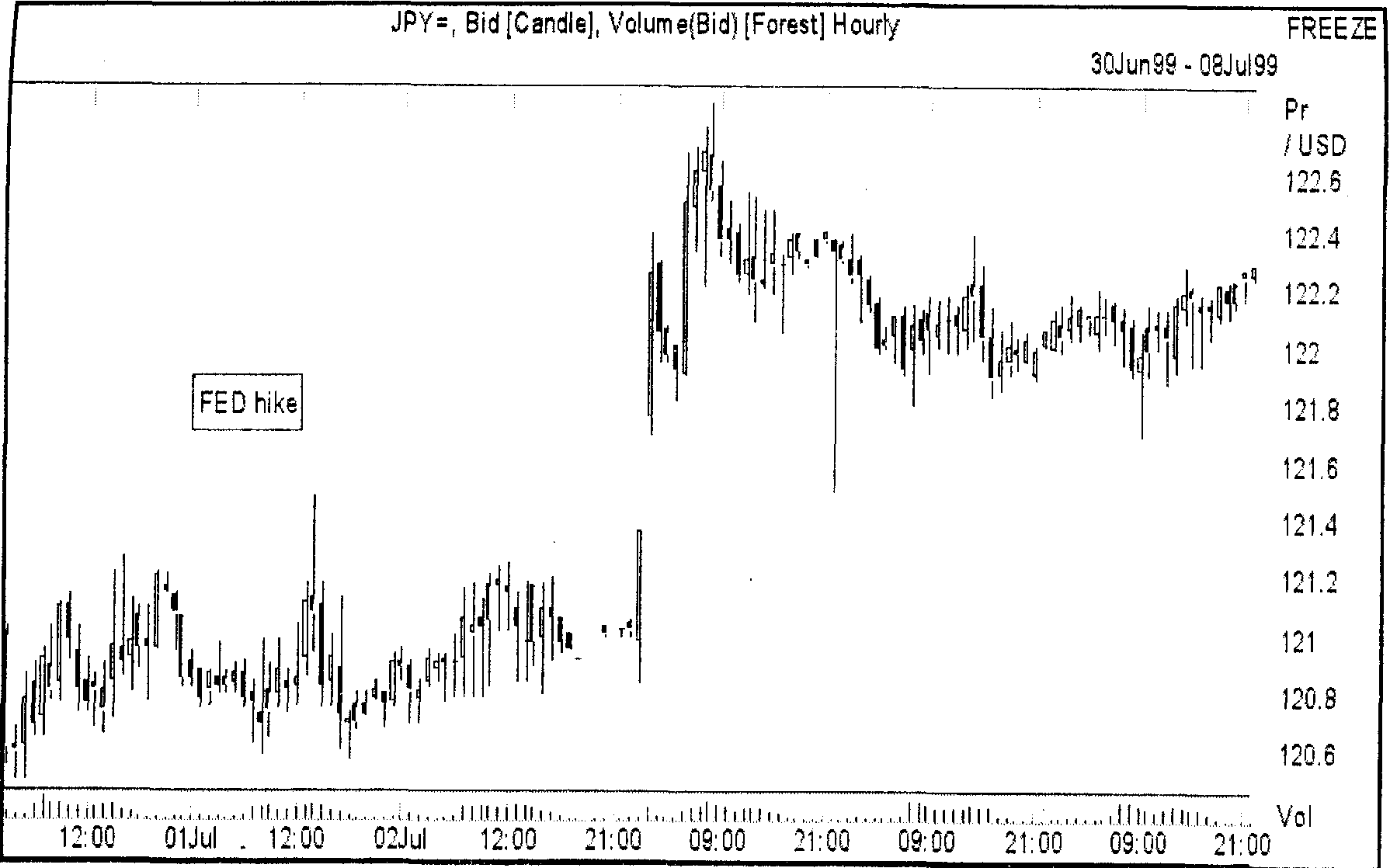 Рис. 16.6. Повышение ставок FED I июля и интервенция Банка Японии; график курса доллар/йена