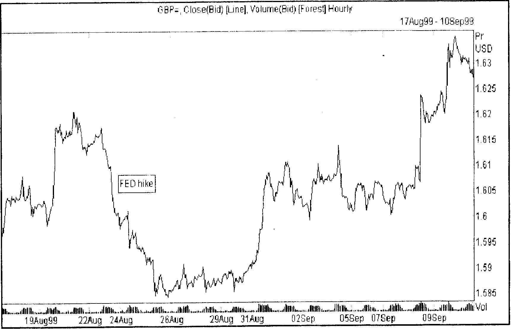 Рис. 16.3. Повышение ставок FED, 24 августа I999 г., график британского фунта