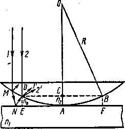 Кольца Ньютона. Интерференционную картину полос равной толщины можно наблюдать от воздушной прослойки, образованной плоскопараллельной пластинкой и соприкасающейся с ней плосковыпуклой (рисунок - 4.16) или двояковыпуклой линзой. Роль пластинки переменной толщины играет воздушная прослойка между линзой и плоскопараллельной пластинкой. Границы этой «пластинки» определяются снизу верхней поверхностью плоскопараллельной пластинки, сверху — нижней поверхностью линзы.