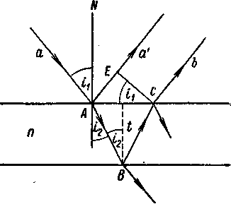 Радужное окрашивание тонких пленок (масляные пленки на воде, мыльные пузыри, оксидные пленки на металлах), возникает в результате интерференции света, отраженного двумя поверхностями пленки. Пусть на плоскопараллельную прозрачную пленку с показателем преломления п и толщиной t под углом i1 (рисунок - 4.13) падает плоская монохроматическая волна (для простоты рассмотрим один луч). Этот луч частично отразится, образовав луч а', частично преломится и упадет на вторую поверхность пластины в точке В, где он снова частично преломится и частично отразится и выйдет на поверхность как луч b. Два отраженных пучка а' и b интерферируют между собой, результат которой зависит от оптической разности хода этих лучей. Произведение показателя преломления на длину пути называется оптической длиной пути. Лучи а' и b распространяются в средах с разными показателями (n0 и n) и проходят до встречи для интерференции разный геометрический путь.