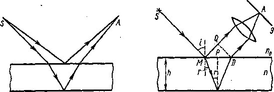 Рассмотрим случай, когда источник находится в бесконечности, т. е. отраженные от поверхности лучи идут параллельно и наблюдение производится глазом, адаптированным на бесконечность или же в фокальной плоскости объектива телескопа. В этом случае оба интерферирующих луча, идущих от S к A, происходят от одного падающего луча SM (рисунок - 4.16). Поверхность плоскопараллельной пластинки из прозрачного материала освещается точечным источником монохроматического света (рисунок - 4.14). В произвольную точку А, расположенную по ту же сторону пластинки, что и источник S, приходят два луча: один, отраженный от верхней, другой — от нижней поверхностей. В зависимости от оптической разности хода лучей в точке А будут наблюдаться максимум или минимум. Оба луча исходят из одного и того же источника и, являясь когерентными, дают нелокализованную интерференционную картину. Для их наблюдения используют собирающую линзу и экран, расположенный в фокальной плоскости линзы. Лучи, наклоненные под одним углом, соберутся на экране в одной точке, отраженные под другим углом – в другой точке, и мы получим систему на экране полосы равного наклона.