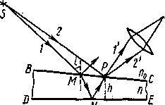 Произвольный луч SM, исходящий из источника монохроматического света S, частично отразится от верхней поверхности, частично проходит внутрь пленки и после отражения от нижней поверхности выйдет из точки Р (луч 1'). В световом потоке, исходящем из источника S, всегда найдется луч, который, попадая в точку Р, частично отражается от верхней поверхности (луч 2').