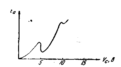 При повышении потенциала сетки Vc число электронов, отсасываемых от катода, увеличивается, и ток в анодной цепи растет. Это возрастание, однако, при некотором потенциале прекращается, и наступает резкий спад (рисунок - 4.73). На рисунке – 4.73 изображена зависимость тока ia от ускоряющего потенциала Vc для случая, когда трубка заполнена парами ртути (опыты Франка и Герца). Начальный (возрастающий) участок кривой имеет вид, типичный для вольтамперных характеристик термоэлектронных приборов. Но при Vc = 4,9 в ток резко падает, а затем опять начинает возрастать. Менее резкие скачки наблюдаются и при некоторых других значениях Vc, больших 4,9 в.