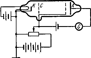 частью установки является трубка, заполненная исследуемым газом при небольшом давлении (так что пробег электрона оказывается порядка размеров трубки). Внутри трубки находился подогреваемый катод К, являющийся эмиттером электронов, сетка С и анод А. На сетку подается ускоряющий потенциал Vc, величина которого может плавно изменяться. Между анодом и сеткой приложен небольшой задерживающий потенциал (Vca ≈0,2 - 0,5 в). Электроны, ускоренные в зазоре между катодом и сеткой, попадают затем в свободное от поля пространство, ограниченное сеткой С. В этом пространстве в основном и происходят их столкновения с атомами. Те электроны, которые потеряли почти всю свою энергию в результате столкновений с атомами, не могут преодолеть задерживающего поля Vca, остальные электроны попадают на анод А и создают в цепи анода ток ia, регистрируемый гальванометром G.