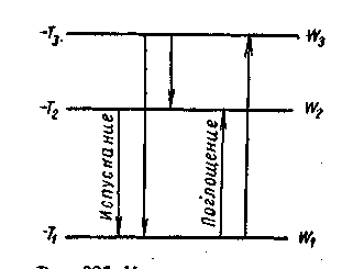 Если необходим переход с уровня с меньшей энергией на уровень с большей энергией, то происходит поглощение кванта света (рисунок - 4.69)