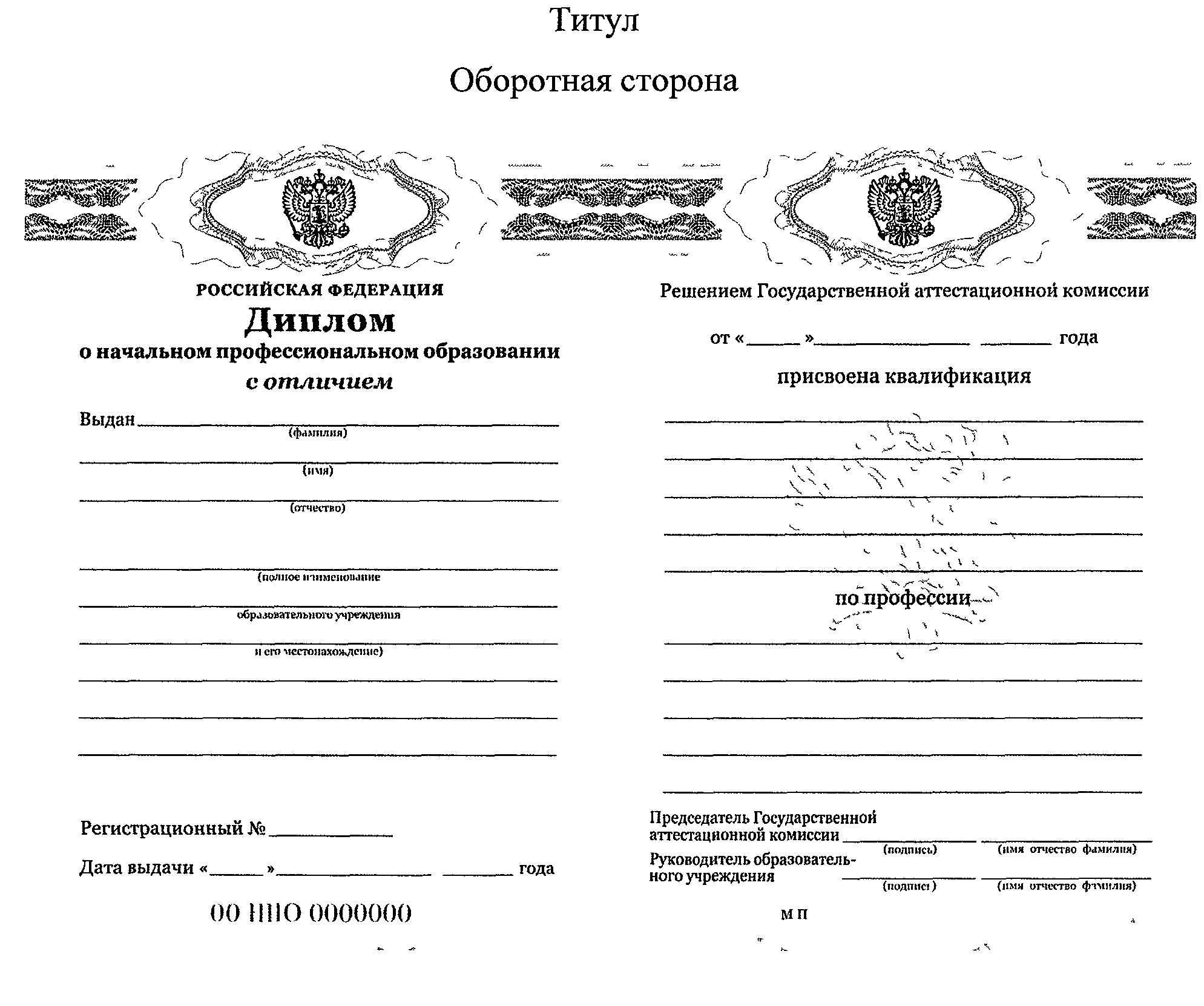 Титул форматом 220 х 160 мм вставляется в твердую обложку, на сгибе которой вклеена упругая планка-сутаж. Цветовой фон лицевой и оборотной сторон титула зеленовато-палевый. На лицевой стороне в верхней части титула нанесены слова "РОССИЙСКАЯ ФЕДЕРАЦИЯ", в центре титула стилизованное изображение Государственного флага Российской Федерации и геральдическое изображение Государственного герба Российской Федерации в сетке с ирисным раскатом, в нижней части слова "ДИПЛОМ о начальном профессиональном образовании". На оборотной стороне титула в левой и правой верхней части находятся изображение Государственного герба Российской Федерации. В верхней левой части оборотной стороны титула находятся слова "РОССИЙСКАЯ ФЕДЕРАЦИЯ" и расположена надпись "ДИПЛОМ о начальном профессиональном образовании", в нижней левой части - порядковая нумерация.