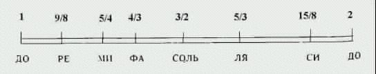Если принять до за единицу, тогда ре будет составлять 9/8, ми -- 5/4, фа -- 4/3, соль -- 3/2, ля -- 5/3, си -- 15/8, до -- 2.