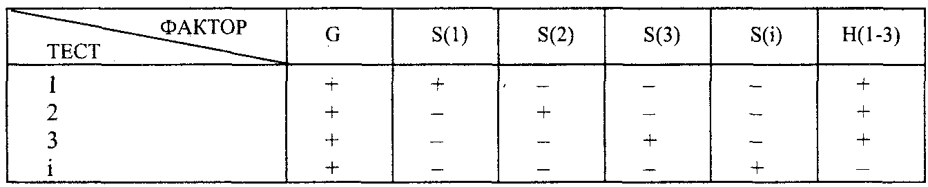 Основы факторной теории интеллекта были разработаны в 20-х годах XX века Чарльзом Спирменом. В основе теории, с одной стороны, лежал статистический анализ практических тестов, а с другой — постулат о существовании некоторого универсального интеллектуального фактора С, названного генеральным, а также наборов специфических S(n) и групповых Н(п) факторов. Строго говоря, каждый S(i) специфический фактор из набора S(n) определяется наличием i-й тестовой методики измерения интеллектуальных способностей, что может быть представлено в виде матрицы (табл. 3).