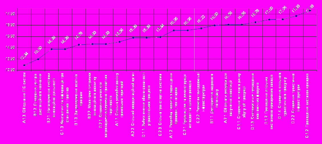 - На графіку 13 показаний розподіл проектів (оперативних цілей) за кількістю набраних балів. Як можна побачити, оцінки розподілилися нерівномірно в діапазоні від 12,94 до 17,83.