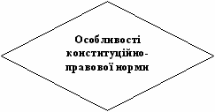 | 1. Встановлюється державою. 2. Виражає державну волю. 3. Формально закріплена та є загальнообов’язковою. 4. Міститься в нормативно-правових актах видаваних компетентними органами. 5. Стає обов’язковою для всіх учасників регульованих суспільних відносин, визначає їх права та обов’язки. 6. Реалізація цієї норми забезпечується примусовою силою. | 1. Регулює особливе, з огляду на його важливість, коло суспільних відносин, що безпосередньо стосується здійснення народовладдя. 2. Встановлює порядок створення інших правових норм, який є обов’язковим для інших галузей права. 3. Має вищу юридичну силу щодо інших правових норм. 4. Відрізняється особливою структурою в тому розумінні, що для неї не є характерною тричлена структура (гіпотеза, диспозиція, санкція). Деякі конституційно-правові норми (норми-принципи, норми-декларації) взагалі мають лише диспозицію. 5. Норми конституційного права є підставою для інших галузей права. |