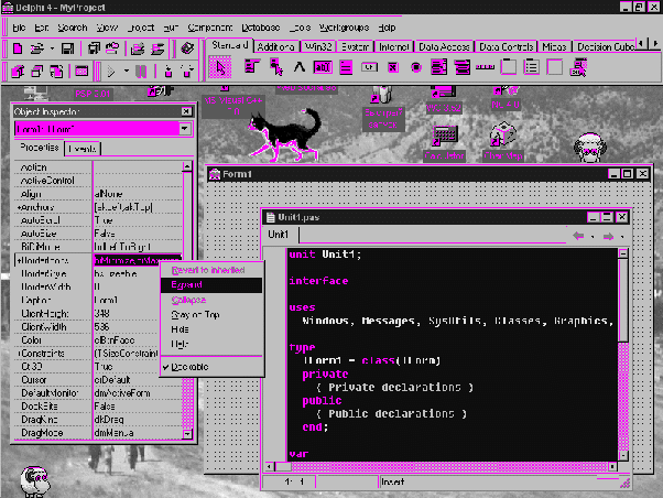 Для системы C++Builder объединяющий файл имеет расширение BPR, в проекте присутствуют DFM, CPP, H, RES - файлы. Общего правила 'отдельный проект = отдельный каталог' рекомендуется придерживаться неизменно. Вышеприведенный список файлов проекта минимален - в процессе работы над проектом могут требоваться ВМР, DCR, ICO, DSK, HLP и другие файлы. При перенесении проекта между ПЭВМ следует транспортировать все (за исключением включающих в расширение тильду - волнистую черту - файлов). Заметим, что применяющий компоненты третьих фирм разработчик должен перенести также файлы указанных компонентов и инсталлировать их (при этом модифицируются файлы библиотеки). C++Builder. В этом случае прототипы функций и описания данных помещаются в файл с расширением Н (который, впрочем, также автоматически модифицируется при проектировании приложения). Н-файл фактически заменяет USES'ы в стиле Delphi. 4. СОЗДАНИЕ ПРОСТЫХ WINDOWS-ПРИЛОЖЕНИЙ Создание приложений (пользовательских программ) в среде Delphi не требует знания тысяч тонкостей программирования под WINDOWS (хотя по мере повышения требований и собственной квалификации пользующийся Delphi разработчик неизменно вынужден будет постепенно постигать тонкости WINDOWS-программирования). Delphi / C++Builder скрывают (инкапсулируют) от пользователя бесконечные тонкости WINDOWS-программирования, позволяя строить приложения 'на лету' - буквально в течении минут создавая готовое WINDOWS-приложение. 4.1. ФОРМА - ОСНОВА РАЗРАБОТКИ ПРИЛОЖЕНИЯ В Delphi Основным интерфейсным элементом в Delphi является форма (Form). С точки зрения WINDOWS форма суть прототип будущего окна WINDOWS. С точки зрения Delphi форма представляет собой присущий любой исполняемой с этой среде программе визуальный компонент, являющийся контейнером (т.е. включающий в себя) другие компоненты, определяющие функциональность данного приложения. Заметим, что приложение может содержать несколько форм (многооконное приложение), несущих каждая свою функциональную нагрузку и активизируемых/закрываемых в нужный момент. На рис.1 приведена копия экрана дисплея, содержащая (в правой части) пустую форму с именем Form1 (форма является принадлежащим к классу TForm Delphi - компонентом). Созданная в проекте первой форма будет являться главной (появляющейся первой) формой приложения. В принципе содержащий одну форму (и только форму) проект вполне работоспособен и может быть откомпилирован и выполнен (для компиляции следует использовать Compile|Compile или сочетание клавиш Ctrl+F9 или Compile|Build All, для запуска на исполнение Run|Run или F9). При старте такого ЕХЕ-файла на экране дисплея появится пустое, не реагирующая на нажатия клавиш windows-окно, которое, однако можно перемещать по экрану, изменять его размеры, минимизировать, свертывать в иконку и закрывать. Заметим, при этом пользователем не написано ни строки кода ! В левой части рис.1 видно окно Object Inspector'a (Инспектора Объектов) - инструмента, с помощью которого пользователь устанавливает свойства объектов и назначает (во время разработки программы - DesignTime) методы-обработчики событий. На примере использования Object Inspector'a при проектировании формы рассмотрим особенности его функционирования при конкретизации свойств и методов всех других объектов (Object Inspector вызывается View|Object Inspector или клавишей F11). В верхней части окна Object Inspector'a имеется выпадающий список (фактическое выпадение происходит при одинарном 