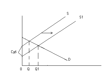 В результаті і в першому і в другому випадках витрати фірм збільшуються і крива пропозиції зміщується ліворуч (S1). Рівноважний обсяг виробництва зменшуються (Q1) і використання ресурсів скорочується.